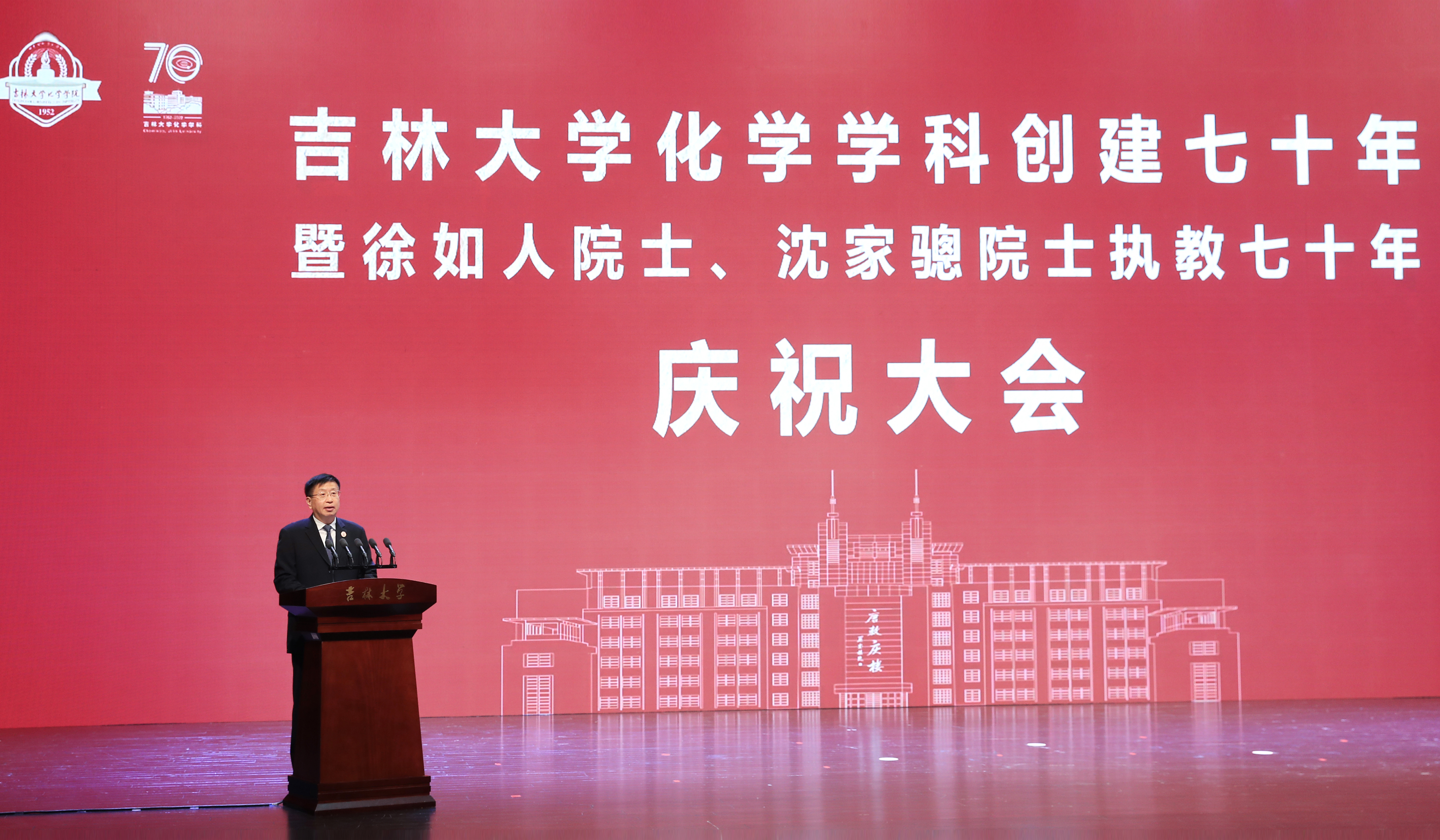 安立佳代表吉林省政府向吉林大学化学学科创建70年表示祝贺,向为吉林教育科研事业耕耘奉献的专家学者和师生员工表达敬意,高度肯定了吉林大学与吉大化学学科为推动基础研究和吉林振兴发展作出的突出贡献。他指出,70年来,吉大化学始终坚持党的领导,坚定社会主义办学方向,紧扣立德树人根本任务,牢记“为党育人、为国育才”的初心使命,一流学科建设令人振奋,人才培养质量稳步提升,科技创新成果不断体现,以徐如人院士、沈家骢院士为代表的一大批教育家无私奉献,辛勤付出,为吉林科教事业发展奠定了深厚而坚实的基础。希望吉大化学牢记习近平总书记教诲,聚力科研攻关,勇攀科技高峰,坚持“四个面向”,聚焦“六新产业”发展和“四新设施”建设,不断提升原始创新能力,助力吉林创新驱动高质量发展,培养更多适应时代要求和社会发展的高端人才。希望同学们传承吉大化学光荣传统,勤奋进取,努力拼搏,争做有理想、敢担当、能吃苦、肯奋斗的新时代好青年。他表示,吉林省政府将一如既往关心支持吉林大学和吉大化学学科的建设发展,共同推动吉大化学在新发展阶段展现新作为,谱写新篇章。