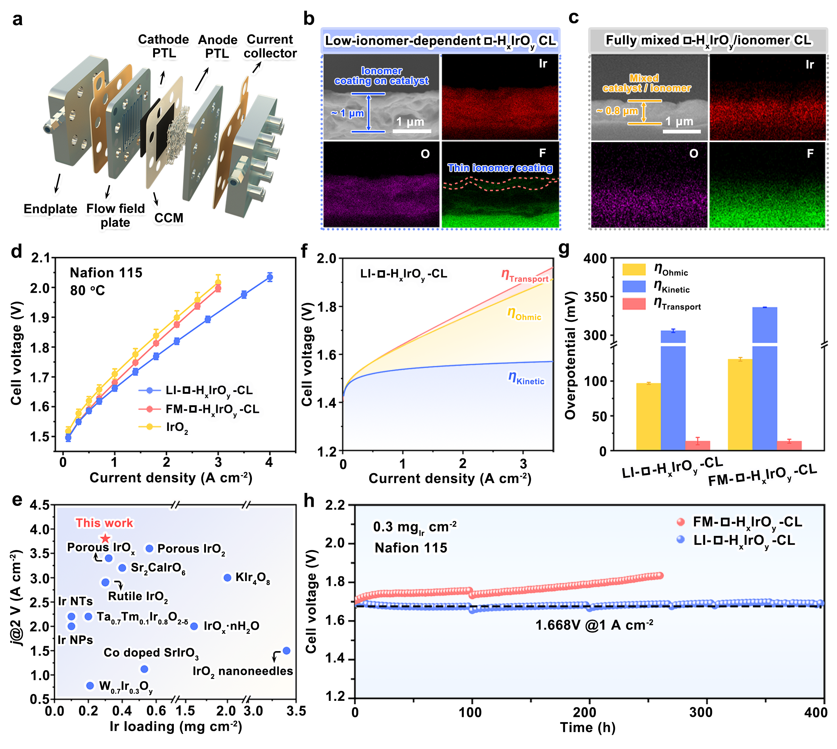 在PEM电解槽中,阳极催化层需同时具备析氧催化、电子传导和质子传导三大功能,以保障析氧反应的高效进行。传统催化层采用IrO2纳米颗粒与离聚物混合的结构,其中IrO2形成电子导电网络并提供催化活性位点,离聚物则作为粘合剂固定催化剂并构建质子传输通道(图1a)。然而,电绝缘性的离聚物会覆盖活性位点并阻碍电子传输。这意味着,优化膜电极性能不仅需要提升催化剂本征活性,还需要改进催化层结构设计。基于此,在本研究中,邹晓新教授团队设计制备了兼具析氧催化与质子传导双功能的层状铱基氧化物*-HxIrOy,通过催化剂的双功能集成,降低了膜电极催化层对离聚物质子传导功能的依赖,实现了铱原子利用率的提升和膜电极三相界面优化(图1b)。
