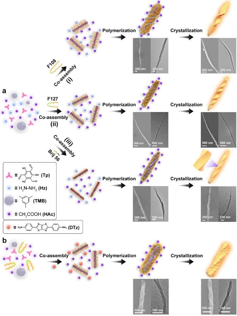 图3.通过调节表面活性剂的种类精确调控(a)COF螺旋结构的分布与堆叠方式以及(b)该方法的通用性。