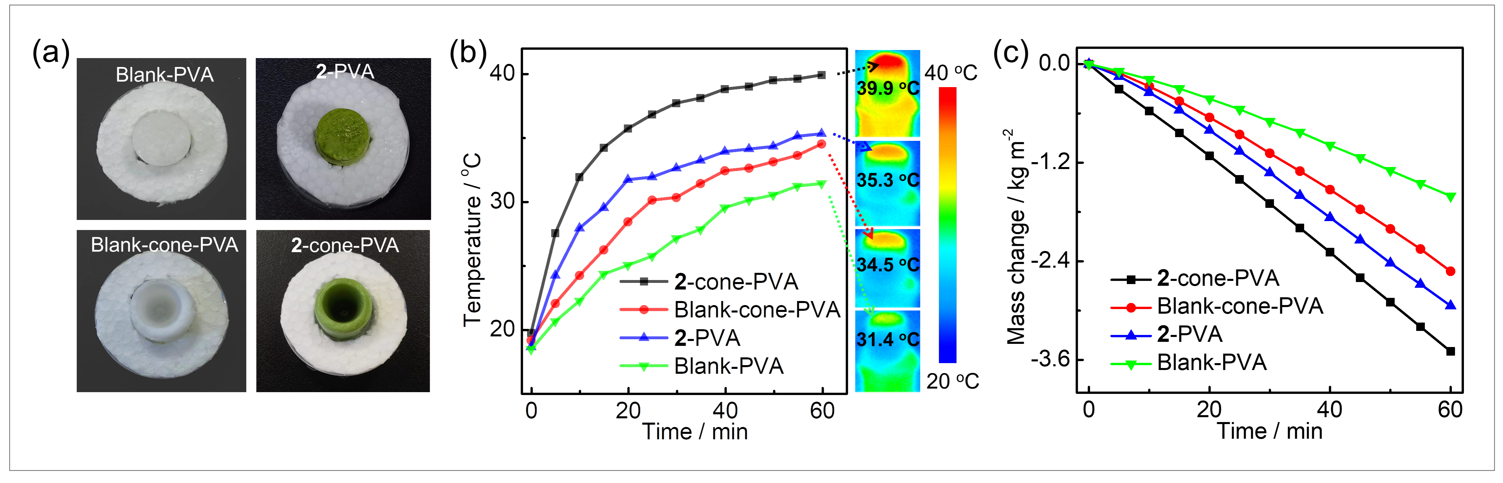 鉴于2表现出优异的光热转换性能,作者将其作为光热活性材料,与多孔聚乙烯醇(PVA)水凝胶混合,组装了具有不同表面形态(平面和锥形空腔)的三维太阳能蒸发器(图4)。经模拟太阳光照射1小时,平面形态和锥形空腔蒸发器的表面温度分别稳定至35.3和39.9oC,说明锥形空腔减少了热损失,提升了光热转换能力。将其应用于太阳能蒸发水,其蒸发水速率达到3.49kg m−2h−1,蒸发水效率提升至84%。