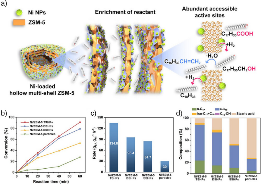 根据上述生长机制,通过调整纯硅前驱物的外延生长的次数,可以得到不同壳层数量的单晶中空ZSM-5分子筛(图三)。在硬脂酸加氢脱氧反应中,负载Ni纳米颗粒的三层中空分子筛(Ni/ZSM-5 TSHPs)在260℃、4 Mpa的氢气条件下,1小时内硬脂酸转化率达到91%,是Ni负载的常规ZSM-5催化剂的3倍。Ni/ZSM-5 TSHPs显著提升的催化性能归因于多层中空纳米反应器对反应物的富集作用以及充分暴露的活性位点(图四)。