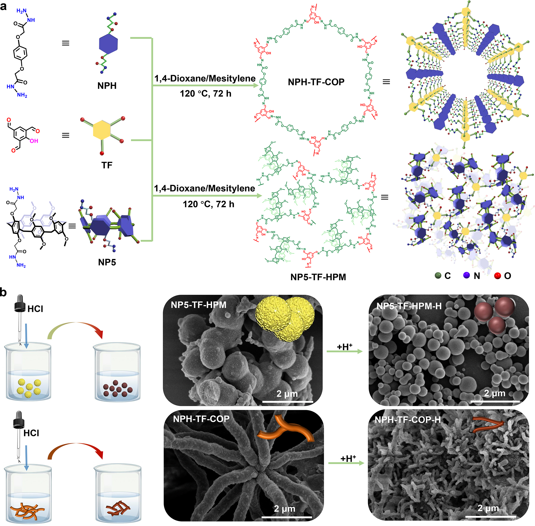 图1.腙键连接的柱芳烃基有机微球的设计路线及其质子化过程的示意图