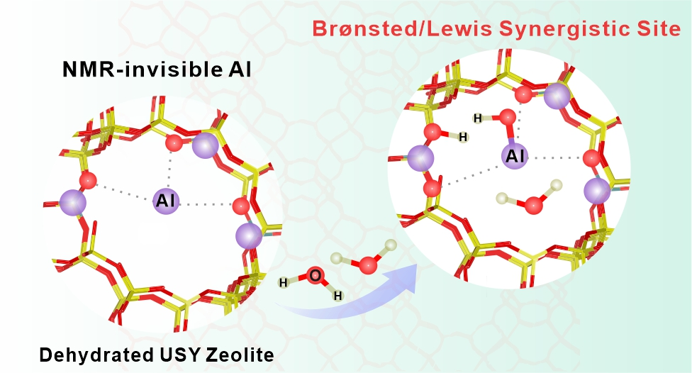 沸石分子筛因其规则的孔道结构、可调变的酸性(酸量、酸强度、酸种类、酸分布等),而被广泛应用于石油化工与精细化工领域。水在分子筛的催化反应过程中扮演了多重角色,既是溶剂、反应物、产物,也可作为反应促进剂,同时还能通过改变分子筛酸性位点的电子环境与配位状态来影响其催化性能。作为主要的Lewis酸物种,分子筛中普遍存在的“NMR不可观测”铝物种(包括三配位骨架以及非骨架铝),其与水的作用机制尚未明确,导致其对催化反应的贡献常常被忽略。