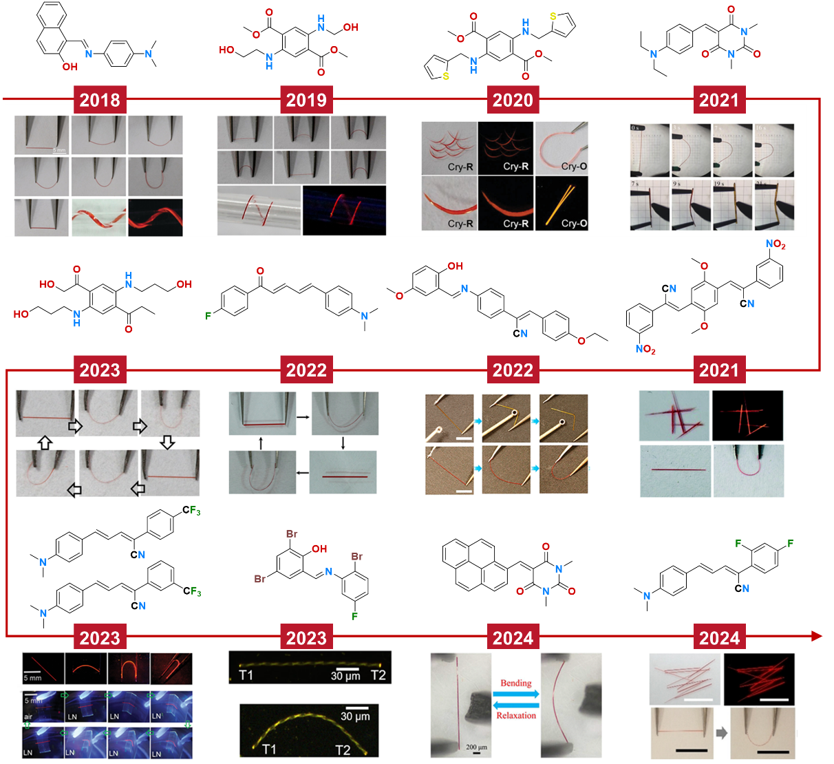 图1.近年来报道的兼具机械柔性和红光发射的有机分子晶体