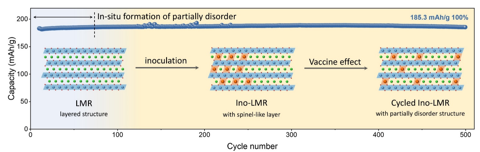 针对上述问题,吉林大学李莉萍教授团队在深入研究掺杂离子对层状氧化物正极影响的基础上,提出了一种在电化学循环过程中原位构建“部分无序”结构,以提升结构与电化学稳定性的策略。首先,采用熔盐离子交换法将Mg离子引入Li层,受限于固相反应动力学,Mg在初始合成阶段主要富集于晶粒表面。但在后续充放电过程中,Mg不断嵌入Li脱出后形成的空位,最终在Li层间均匀分布,形成类似“支柱”的结构,显著增强了材料在高脱锂状态下的稳定性。这种缓慢而可控的结构演化过程有效调节了层间相互作用,抑制了体相的结构坍塌。该过程中Mg离子的掺杂与演化如同疫苗在体内逐步建立免疫屏障,因此被形象地称为“疫苗效应”。此外,材料中还引入了Zr元素以增强M–O共价键,抑制高电压下晶格氧的流失,从而缓解结构破坏。通过结构支撑与稳定晶格氧的双重调控,实现了无钴富锂锰基正极材料在500圈循环内无容量衰减的超高稳定性,展示出优异的实用前景。