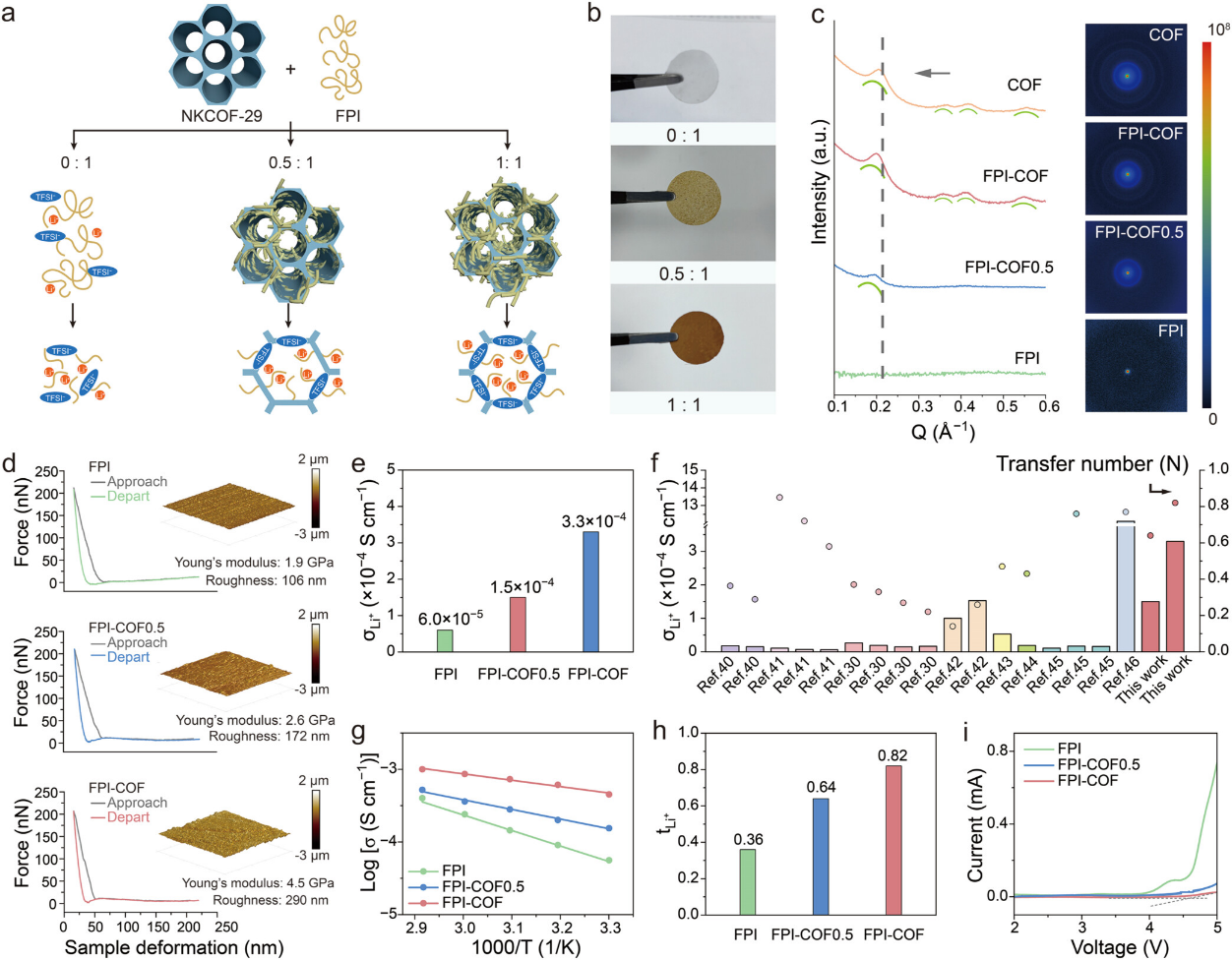 针对上述难题,徐吉静教授团队近日设计并开发了一种具有同源酰亚胺键的聚合物-共价有机框架复合固态电解质,用于构建安全稳定的固态锂电池。含酰亚胺键的共价有机框架材料凭借其有序通道,可作为锂离子选择性闸门和传导桥梁,在维持结构稳定性的同时促进高效离子传输。富含酰亚胺键的氟化聚酰亚胺聚合物增强了材料的机械强度、柔韧性及与锂金属电极的界面相容性,有效抑制枝晶生长并提升电池长时间循环稳定性。得益于共价有机框架与聚合物的协同效应,该聚合物-共价有机框架复合固态电解质实现了3.3×10−4S cm−1的离子电导率和0.82的迁移数,并具有>4.6V的电化学稳定窗口。