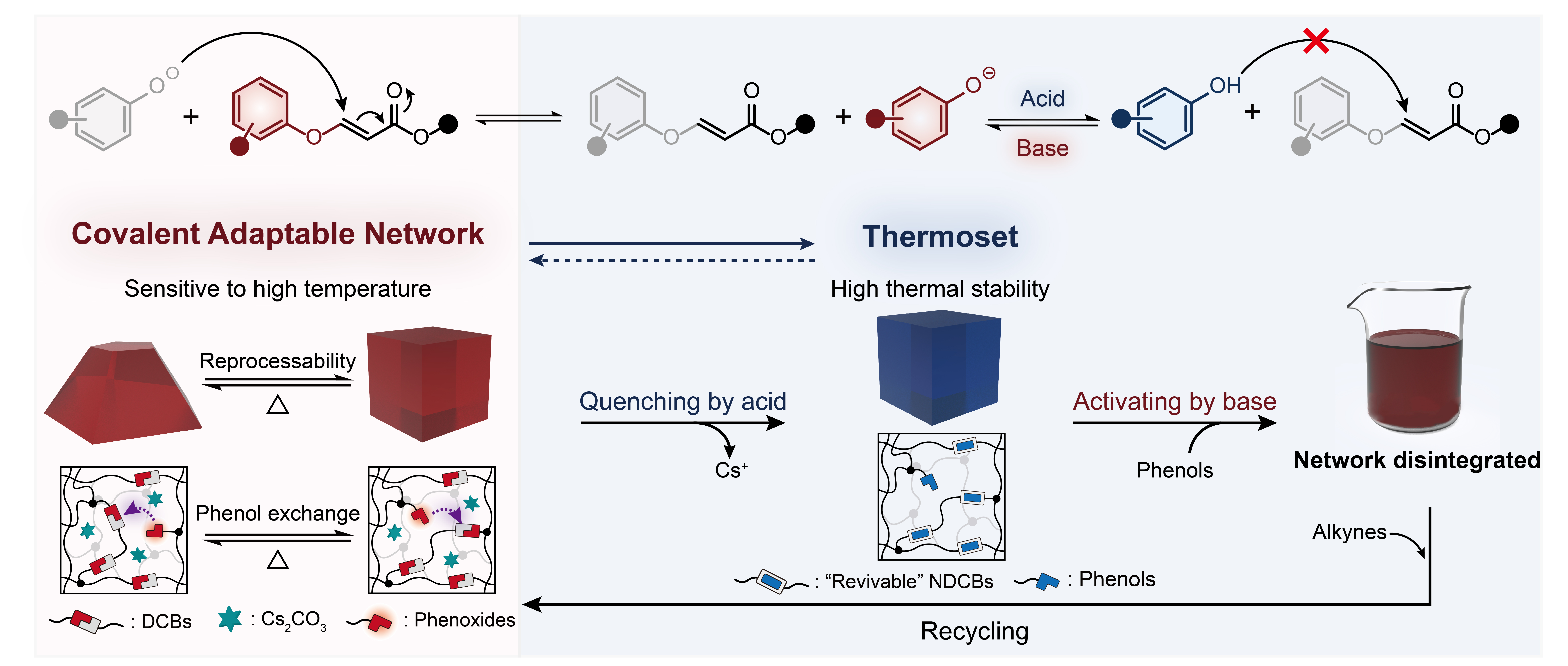 相对于热塑性聚合物,热固性聚合物具有优异的力学性能、热稳定性和耐溶剂性,在人类生产生活中广泛应用。然而,由于其永久共价交联结构,无法实现熔融再加工与循环利用,造成了严重的环境负担。基于动态共价键构筑的动态共价聚合物(共价自适应网络,CANs)可通过热激活动态键交换反应实现重塑加工与循环利用。然而,热激活的网络重构会导致材料在高温下力学性能和尺寸稳定性显著下降,导致了可持续性与热稳定性之间的固有矛盾,成为限制动态共价聚合物实际应用的关键瓶颈。