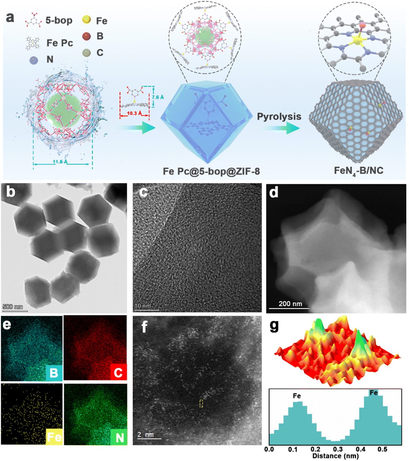 图1:FeN4–B/NC的合成路径示意图和电镜图。