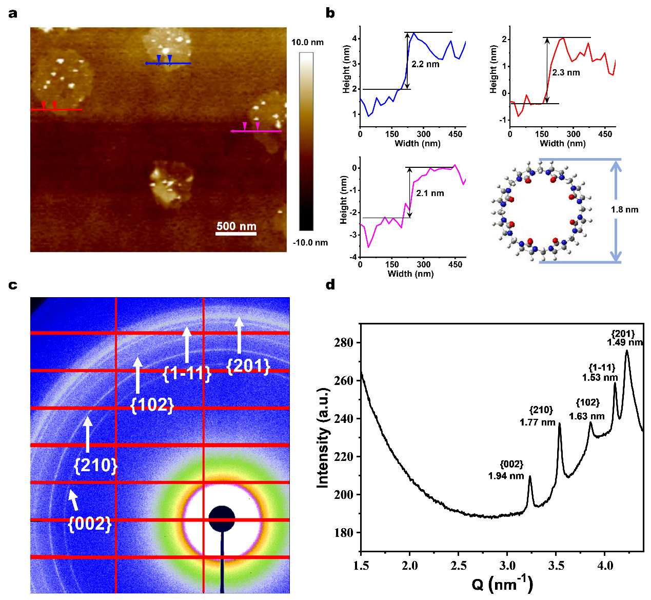 图2. SOF材料的结构表征(a) TTM-3IMB@CB[8]的敲击模式原子力显微镜(Tapping-mode AFM)图像 (b) 所得片层厚度与CB[8]的高度相一致 (c) TTM-3IMB@CB[8]的固相二维小角X射线散射(2D SAXS)图像 (d) TTM-3IMB@CB[8]的固相SAXS剖面曲线