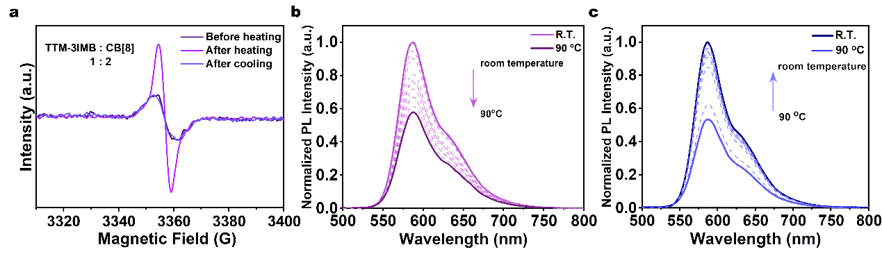 图3. SOF材料的动态可逆性研究(a) TTM-3IMB@CB[8]的温度依赖EPR谱图 (b) 将TTM-3IMB@CB[8]逐渐加热到90OC的光致发光(PL)光谱 (c) 将TTM-3IMB@CB[8]逐渐冷却至室温的PL光谱