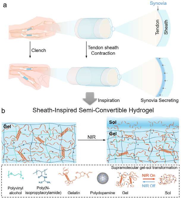肌腱周围滑膜鞘的动态润滑对肢体运动至关重要。受滑膜鞘启发而设计的软体执行器和可移植替代水凝胶主要聚焦材料的高韧性和固有润滑能力。然而腱鞘的润滑是一个动态的过程,如何设计具有类似腱鞘持续分泌润滑液功能、可逆性收缩性和高耐久性的仿生水凝胶仍是一项重大挑战。