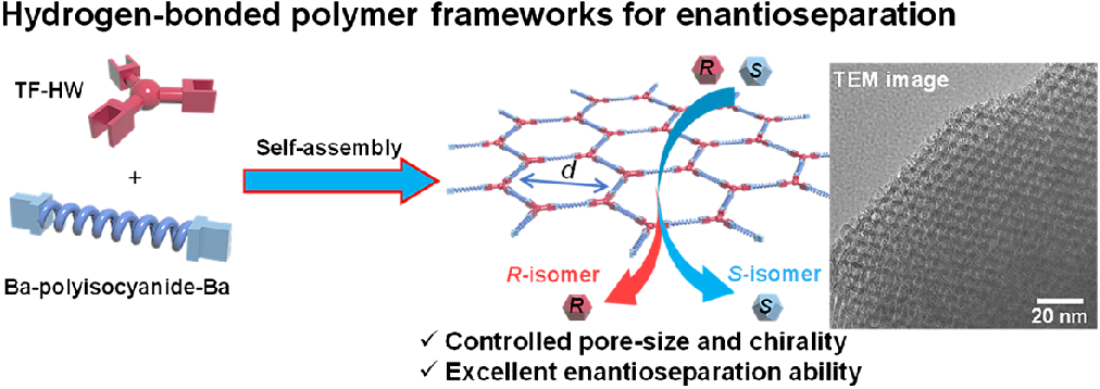 基于此,吴宗铨教授团队通过钯催化活性聚合合成了端基带有巴比妥酸单元的左手和右手螺旋聚异腈,并利用其与三官能Hamilton楔形分子的氢键自组装,构建了一系列具有规整六边形孔道的手性聚异腈框架(图1)。通过精确调控聚异腈的聚合度,实现了框架孔径从2.62 nm至8.63 nm的线性调控;通过调控单体手性,可控制框架的整体手性。该框架作为手性固定相和分离膜,成功拆分了20种不同尺寸和手性的外消旋小分子及聚合物。研究表明,分离因子取决于孔径与对映体尺寸的匹配度,而对映体洗脱顺序则由框架手性决定。