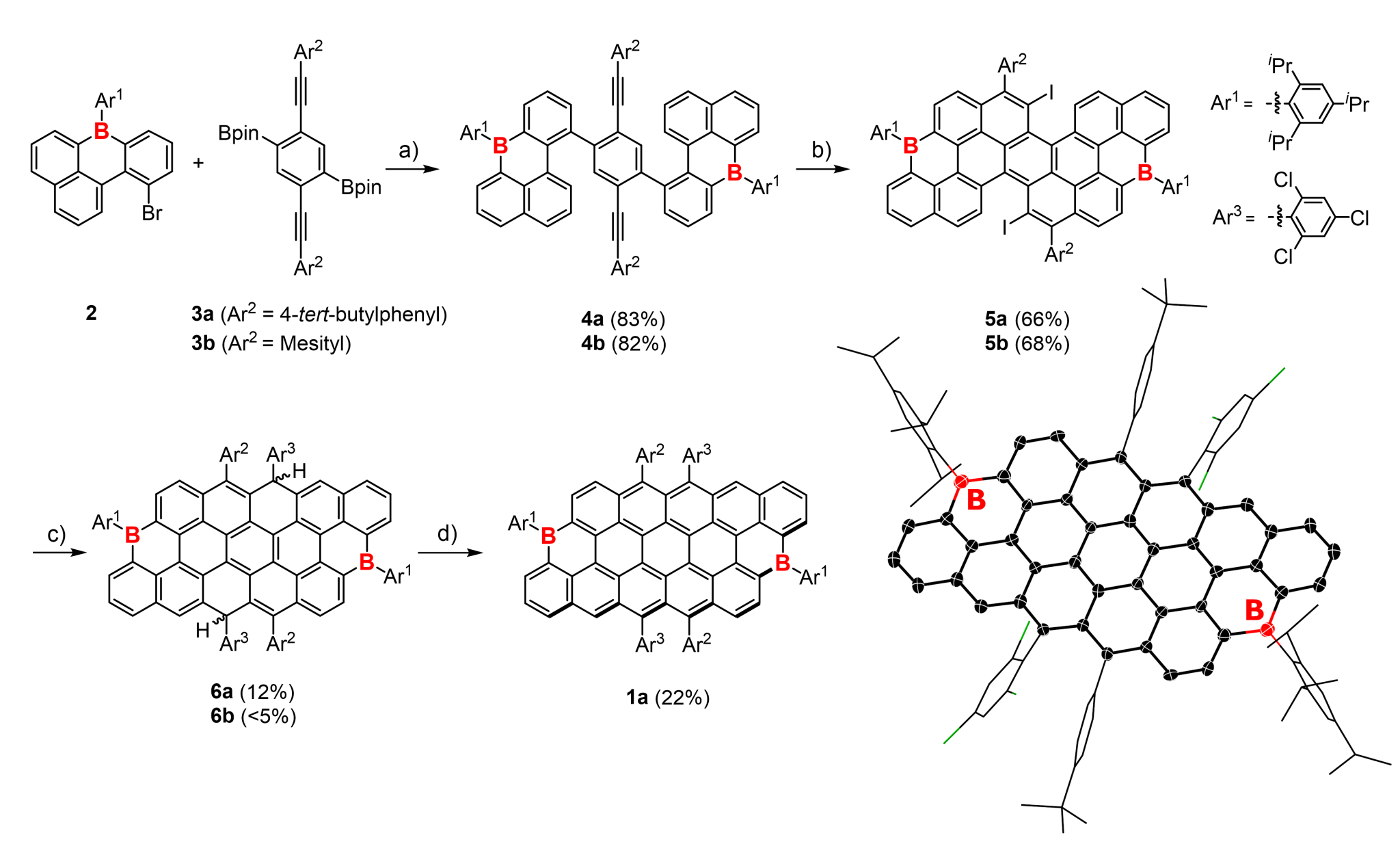 鉴于此,吉林大学窦传冬教授课题组提出了侧位硼掺杂策略(图1),实现了全锯齿边缘peri-Acenoacene的侧向精准硼化,构造了首例硼杂纳米石墨烯双自由基,获得了一种新型“硼杂开壳分子碳”。研究证明,该分子兼具高自旋基态特征(y= 0.69)、优异稳定性(半衰期46天)、以及超窄能隙(<0.9 eV)和近红外吸收(>1300 nm)等性质,并揭示硼原子独特的成键电子结构是产生上述新奇物理化学性质的关键(J. Am. Chem. Soc. 2026,DOI:10.1021/jacs.6c02485)。