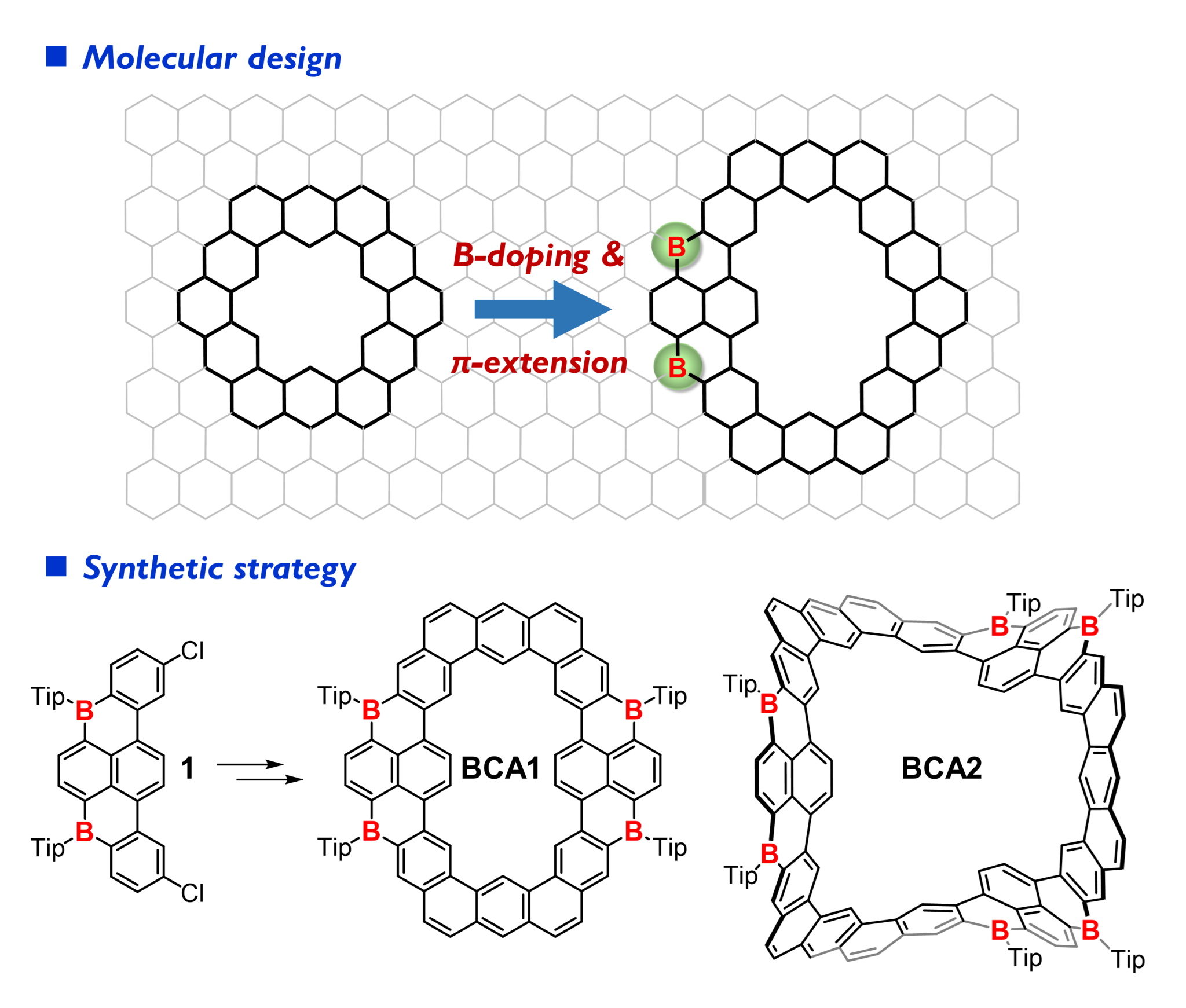 鉴于此,吉林大学窦传冬教授课题组提出并实现了分子环带的硼原子掺杂(图1),通过设计新型硼烷单元、优化大环合成策略,构造出两例纯硼掺杂的分子环带(BCA1和BCA2),进而揭示了硼原子赋予分子环带的独特物化性质,包括低LUMO能级结构、宽光谱吸收和红色荧光性质、以及长程独立还原反应过程和二价阴离子的强开壳双自由基特征。这类分子代表了首例硼杂环带分子碳,成为含硼分子碳家族的新类型成员(Angew. Chem. Int. Ed. 2026, DOI: 10.1002/anie.8330393,VIPpaper)。
